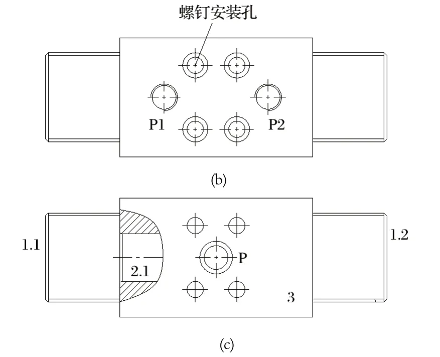 (2) 將兩個插裝閥組合設(shè)計成一個獨立的液動換向閥,再安裝到閥組油路塊上。如圖6 所示,獨立的液動換向閥包含一個獨立的閥體 3,兩端分別安裝有一個插裝組件 2 和一個控制蓋板 1;閥體內(nèi)部設(shè)計有油孔,用于連接兩端的插裝閥;閥體外側(cè)安裝面上設(shè)計有兩個進油孔 P1 和 P2,通過管接頭連接兩個泵裝置;閥體內(nèi)側(cè)安裝面上設(shè)計有一個出油孔 P,閥組油路塊上只需要設(shè)計一個與出油孔 P 配套的供油孔即可;閥體上設(shè)計有螺釘安裝孔,用于將液動換向閥安裝在閥組油路塊上。