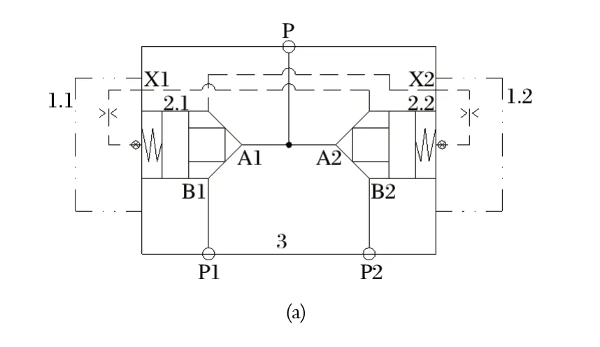 新型液動換向閥是由兩個二通插裝閥組合而成的選擇回路,具備二位三通方向控制閥功能,以實現(xiàn)兩套泵裝置的切換。中信重工 E6118B/E6119B 型液壓站的液壓閥組如圖5 所示。圖5 中,當(dāng) P1 處的泵裝置工作時,插裝組件 2.1 打開,插裝組件 2.2 關(guān)閉,由 P1 處的泵裝置向 P 口供油,P2 處的泵裝置可以維修或停用待命;反之,當(dāng) P2 處的泵裝置工作時,插裝組件 2.2 打開,插裝組件 2.1 關(guān)閉,由 P2 處的泵裝置向 P 口供油,P1 處的泵裝置可以維修或停用待命。