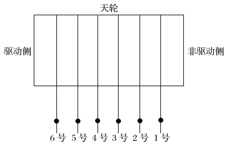3 故障診斷分析3.1 鋼絲繩張力測試分析 鋼絲繩張力測試在 2 種工況下進行,分別是配重在井口時和配重在井底時。測試時,提升機要保持靜止狀態,用小錘依次敲擊鋼絲繩,并用測振儀器記錄數據。從非驅動側到驅動側的鋼絲繩編號為 1~6,如圖 2 所示。鋼絲繩振動測試結果如表 1 所列。