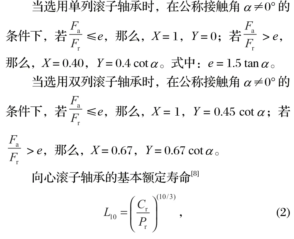 式中:Pr 為聯(lián)合載荷下軸承徑向當(dāng)量動載荷,N;Fr為軸承徑向動載荷,N;Fa 為軸承軸向動載荷,N。
