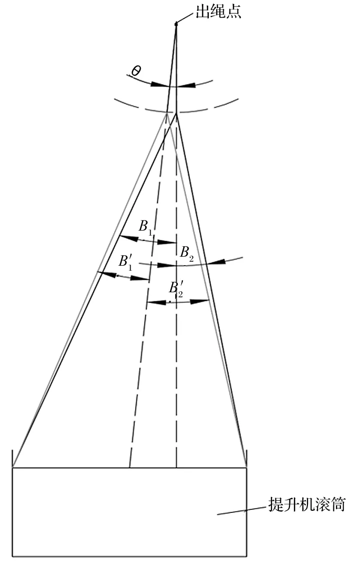 調(diào)整天輪和鋼絲繩內(nèi)外偏角的原則,需保證內(nèi)外偏角值滿足《金屬非金屬礦山安全規(guī)程》規(guī)定,同時還要確保出繩點位置不改變,即出繩點應(yīng)維持在罐籠中 心位置的正上方,保證提升容器穩(wěn)定,如圖 2 所示。θ 為 1 號天輪和基座整體旋轉(zhuǎn)的角度,以出繩點為原點順時針轉(zhuǎn)動;B1 和 B2 為調(diào)整之前的內(nèi)外偏角,圖片′為調(diào)整之后的內(nèi)外偏角,2 號天輪和 1號天輪的調(diào)整方式一致,僅旋轉(zhuǎn)方向為逆時針方向。