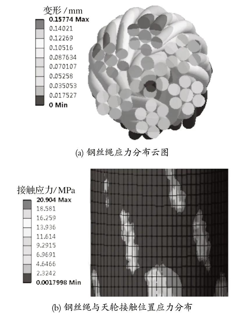 通過仿真結(jié)果可以看出,鋼絲繩的應(yīng)力集中在繩芯處,在 Pro/Engineer 中添加求解項,計算鋼絲繩股內(nèi)的變形以及鋼絲繩和天輪接觸部位的應(yīng)力,可以得到如圖7 所示的計算結(jié)果。